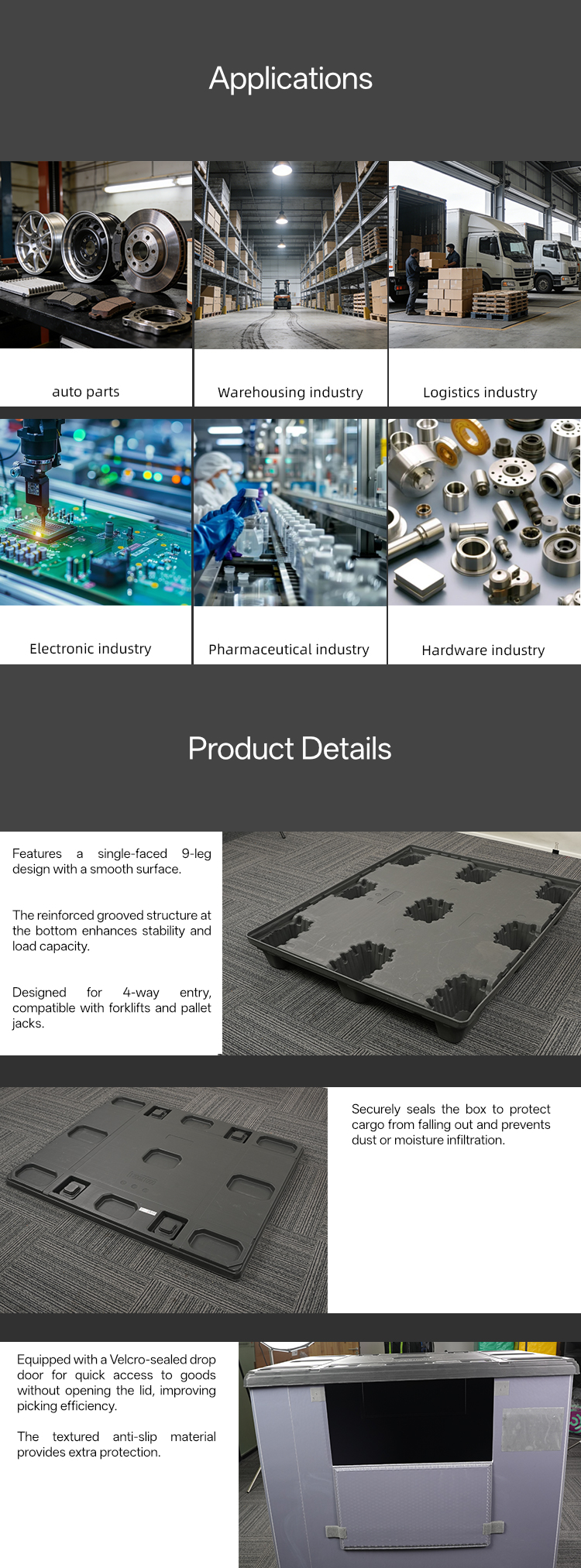 Para Industrias de electrónica de precisión y semiconductores Estas cajas para palés proporcionan un entorno estable y antiestático. Las nervaduras estructurales de la base de 9 patas minimizan las vibraciones durante el transporte, protegiendo así los frágiles conjuntos de PCB y sensores. Gracias a su resistencia al polvo, las unidades impiden la entrada de micropartículas en componentes sensibles, un requisito fundamental para mantener altos índices de rendimiento en la fabricación de productos electrónicos.
