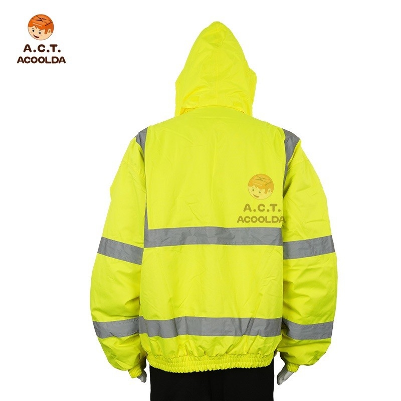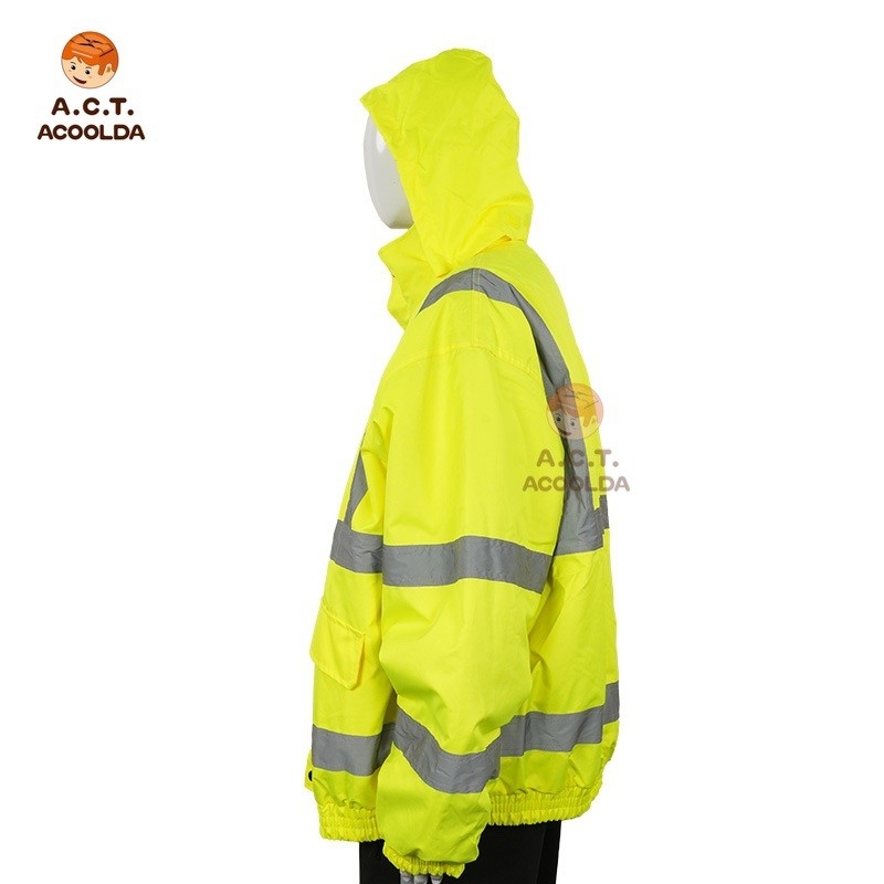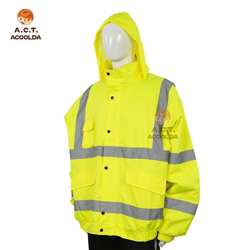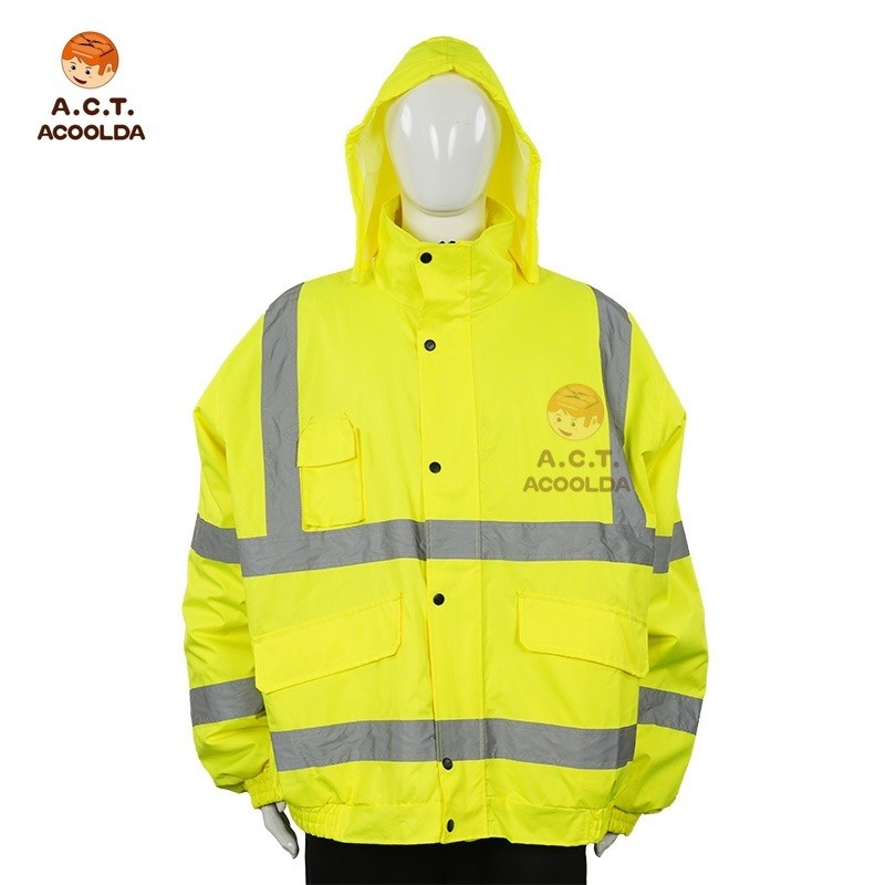 Chaqueta reflectante impermeable amarilla con capucha para conductores y mensajeros. Corte holgado, impermeable y personalizable con logotipo, color y talla. Perfecta para pedidos corporativos al por mayor.
